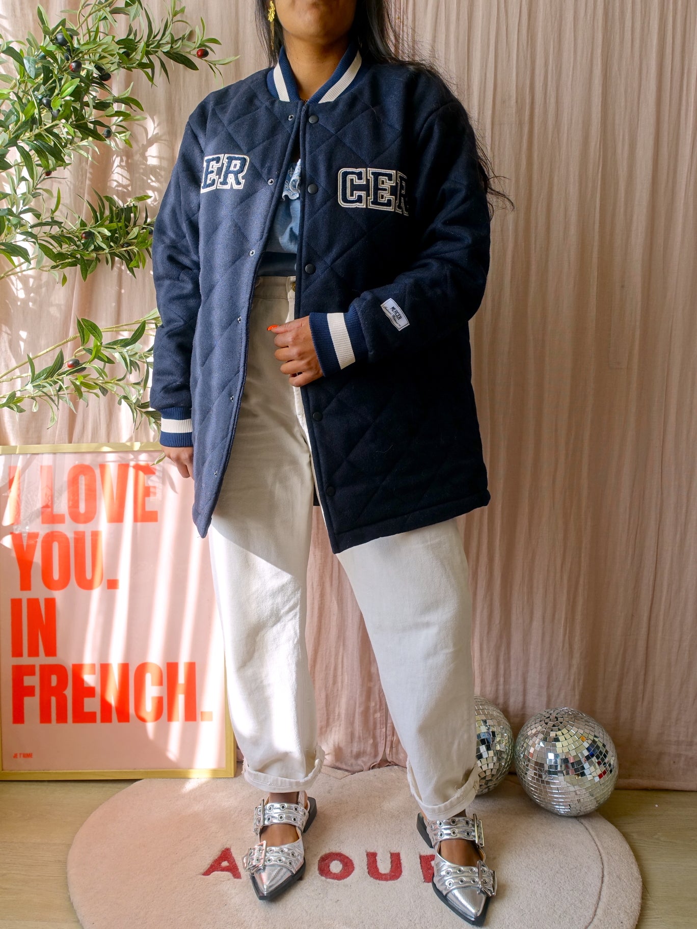 Mercer Amsterdam quilted varsity wool jacket midnight blue