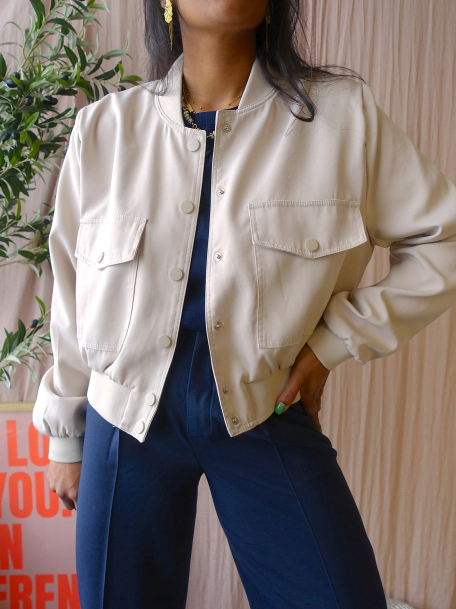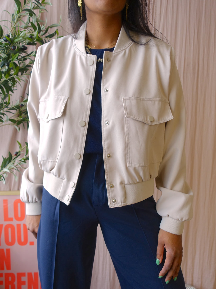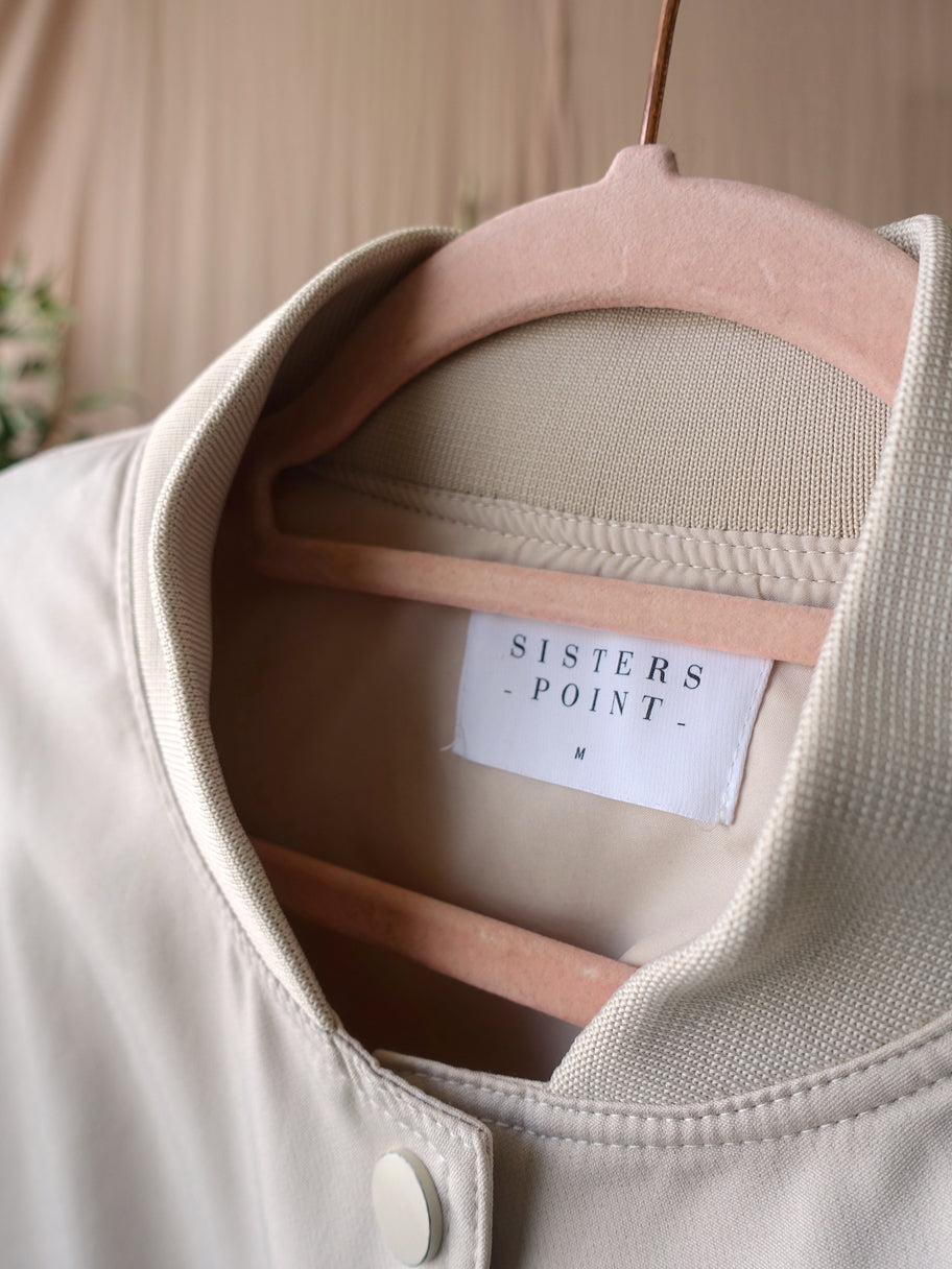 Spotte ik precies dit jasje even op tv bij een kandidaat van B&B Vol Liefde! Sowieso zie je deze bomberjasjes veel, en ze zijn ook ideaal in elk seizoen. Deze van Sisters Point is nog steeds nieuw te koop en van de huidige collectie op dit moment. De creme kleur maakt dat je deze overal bij kunt combineren. Het jasje is gevoerd, heeft een cropped lengte en drukknopen. Deze is van een recente collectie. De fit is iets ruim, deze heeft maat M maar kun je eventueel ook dragen met maat L als je het jasje open laat.