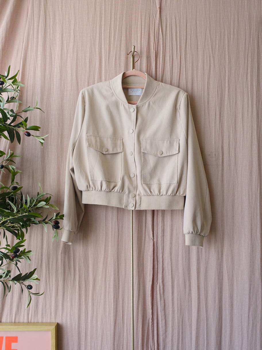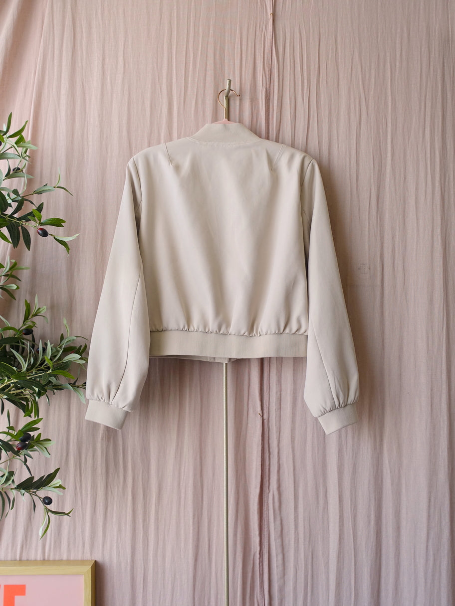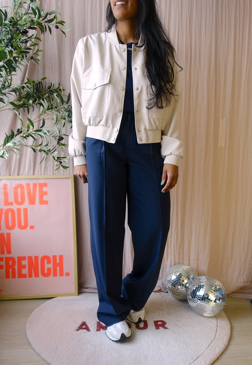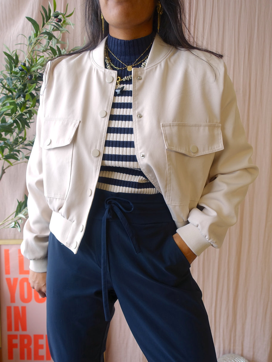 Spotte ik precies dit jasje even op tv bij een kandidaat van B&B Vol Liefde! Sowieso zie je deze bomberjasjes veel, en ze zijn ook ideaal in elk seizoen. Deze van Sisters Point is nog steeds nieuw te koop en van de huidige collectie op dit moment. De creme kleur maakt dat je deze overal bij kunt combineren. Het jasje is gevoerd, heeft een cropped lengte en drukknopen. Deze is van een recente collectie. De fit is iets ruim, deze heeft maat M maar kun je eventueel ook dragen met maat L als je het jasje open laat.
