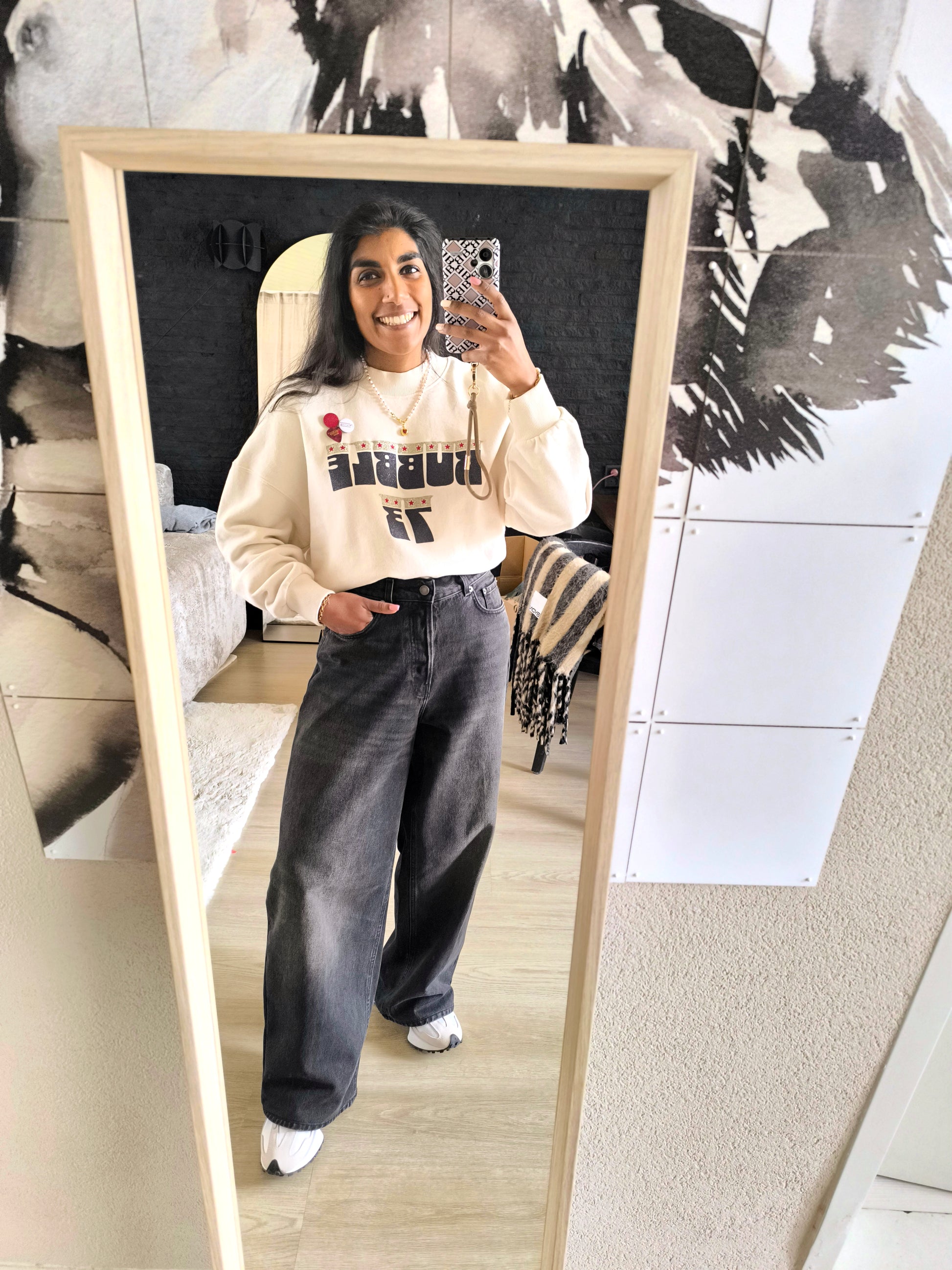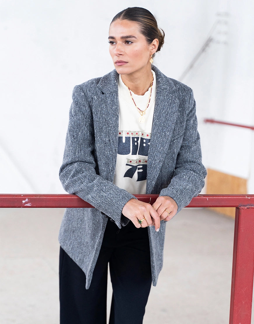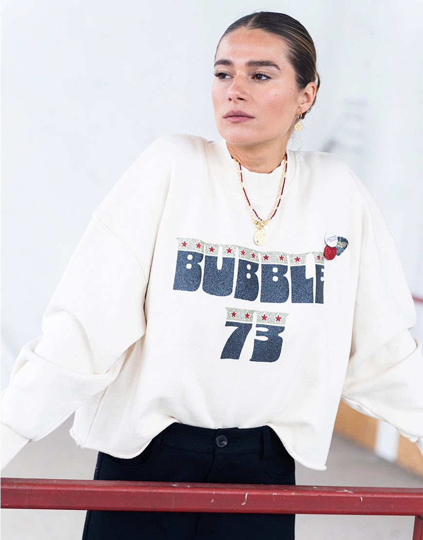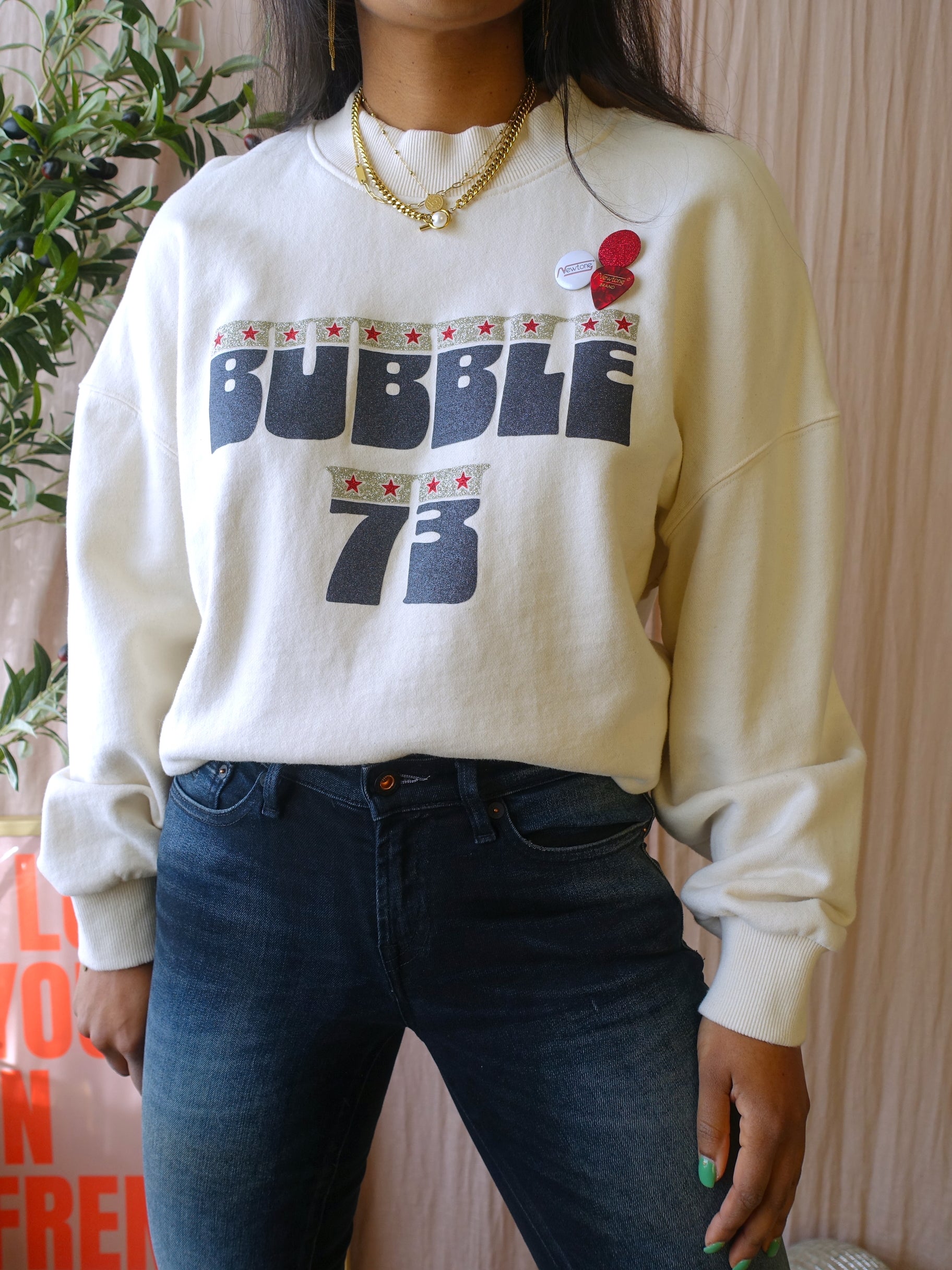 De sweaters van Newtone zijn zo leuk, herkenbaar door de glitter print en de buttons die je erbij krijgt en door de goede kwaliteit. Deze Porter sweater heeft een ecru kleur, een oversized, boxy fit met stoere rafels aan de onderzijde en is gemaakt van 100% katoen. Combineer 'm met een aantal kettingen en je zult zien dat dit prima kan, ondanks de print op de trui. De buttons kun je verwijderen. De sweater heeft maat M, maar kun je dragen tot en met maat L.