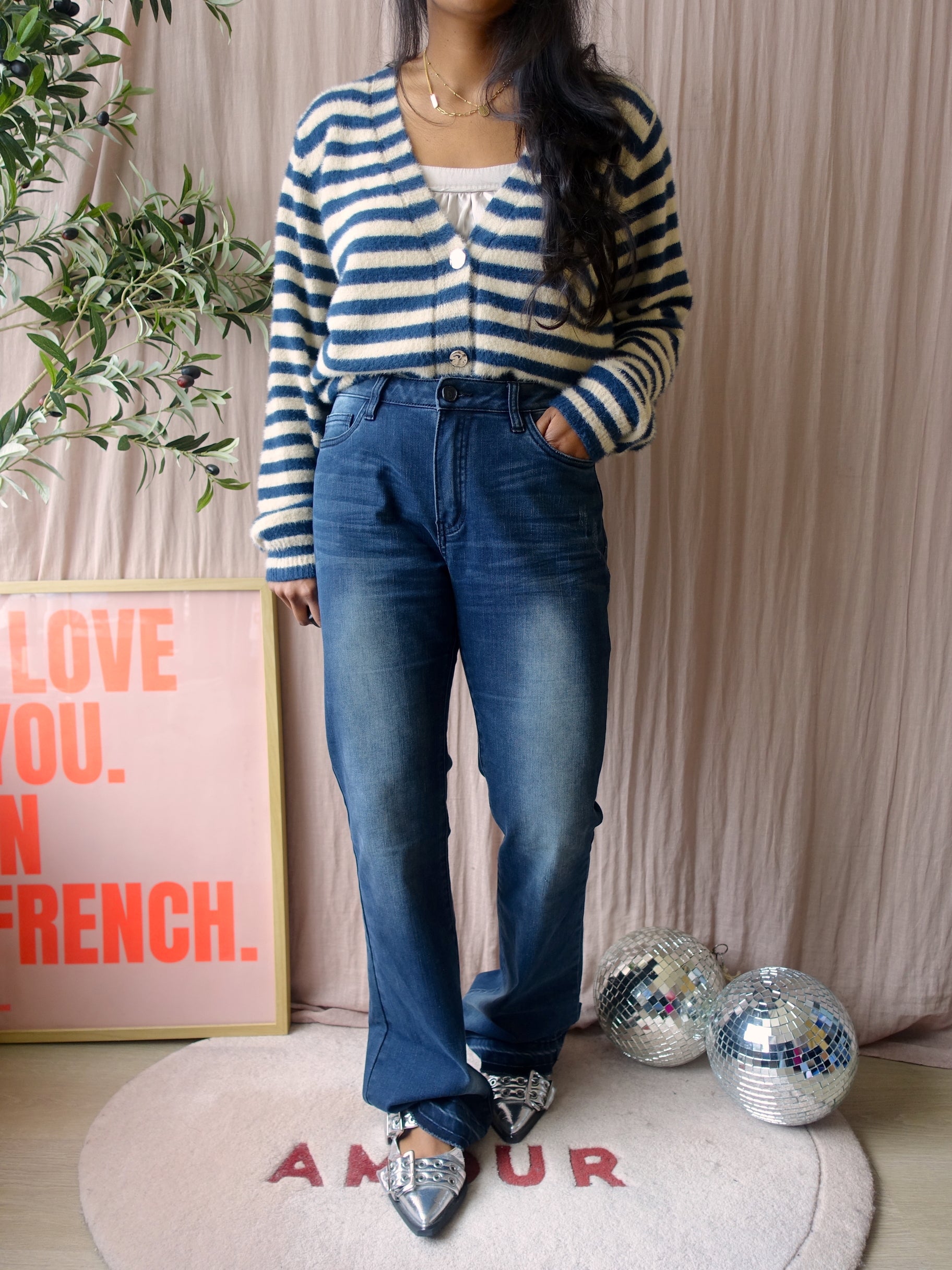 Super zachte cardigan met veel stretch en een relaxed fit. De knopen vallen extra op naast de bretonse streep in jeansblauw. Draag deze op een wide leg jeans met een wit, ecru of beige top er onder en je hebt een fijne outfit voor elke dag. Door de v-hals komen ook je sieraden mooi tot zijn recht bij deze cardigan. Deze heeft maat M, maar valt ruim en kun je dragen tot en met maat L.