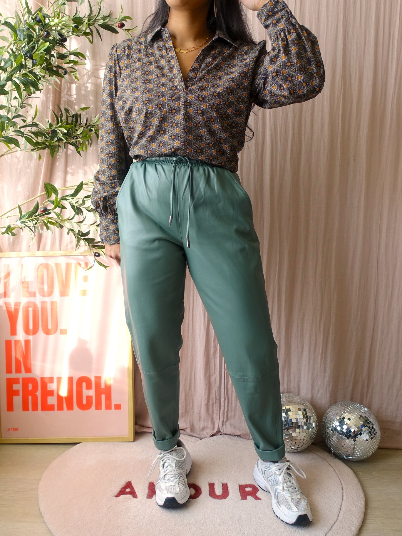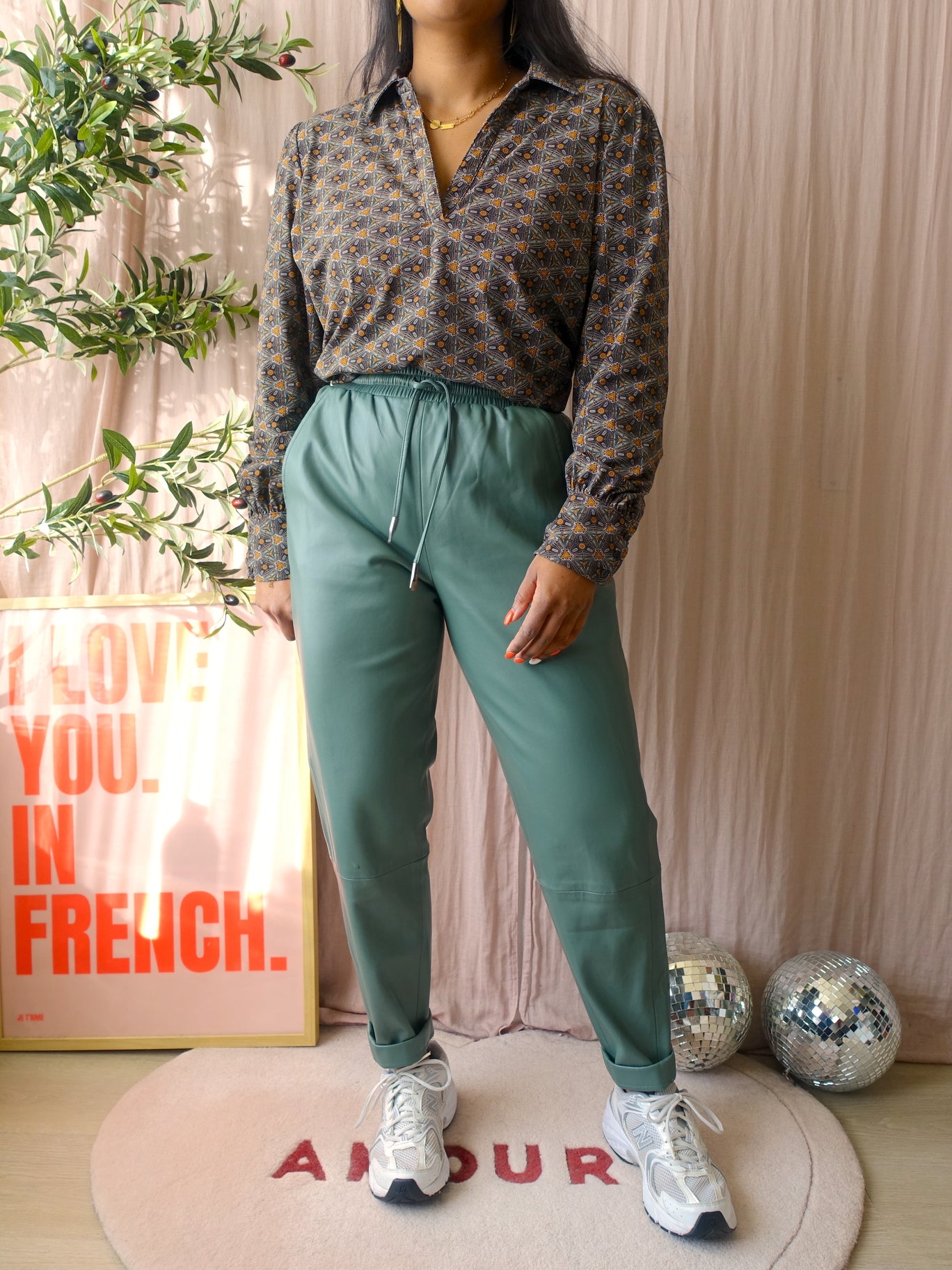 Op deze print raak je niet uitgekeken, deze grafische print is met veel klasse ontworpen en heeft warme kleuren. Het beste is nog dat deze blouse van Tramontana gemaakt is van travelstof en dus kreukvrij is, deze zit altijd meteen in model. De top heeft een v-hals en een subtiel plooi detail aan de achterzijde voor een vrouwelijke uitstraling, net als de boordjes bij de mouwen overigens. Het is op de foto's wellicht wat lastig te zien, maar de meest aanwezige kleuren zijn cognac en donkerblauw, wat van een afstandje ook armygroen kan lijken. Ik vond deze als nieuw. Op de foto's zie je maat XL.