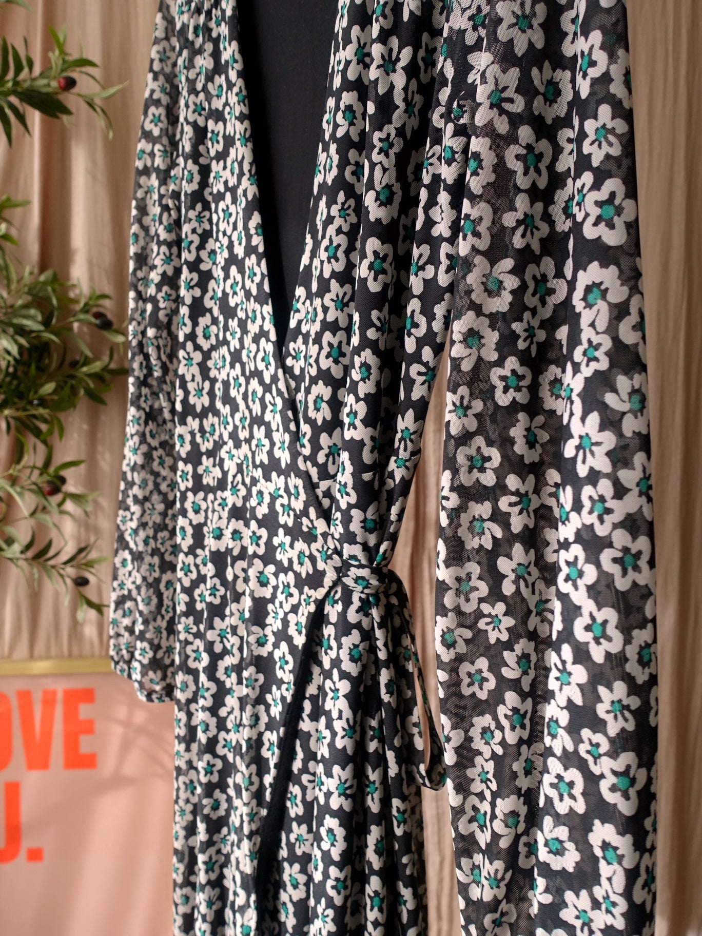 De Natasja Frill Dress is een bekend model bij Fabienne Chapot en is ook precies zo'n 'altijd-goed' model. Deze bevat stretch en is grotendeels gemaakt van gerecycled materiaal. Aan de bloemenprint herken je de Nederlandse designer meteen. Het is een omslag model met een mesh bovenlaag en deze is gevoerd in de body, waarbij de mouwen half doorschijnend blijven. Deze jurk is door de tijdloze kleuren zwart, wit en groen geschikt voor elk seizoen. Of je 'm nu combineert met cowboylaarzen en een gilet in het najaar of met slippertjes en een zomerhoed in het voorjaar, deze kan elke dag gedragen worden!