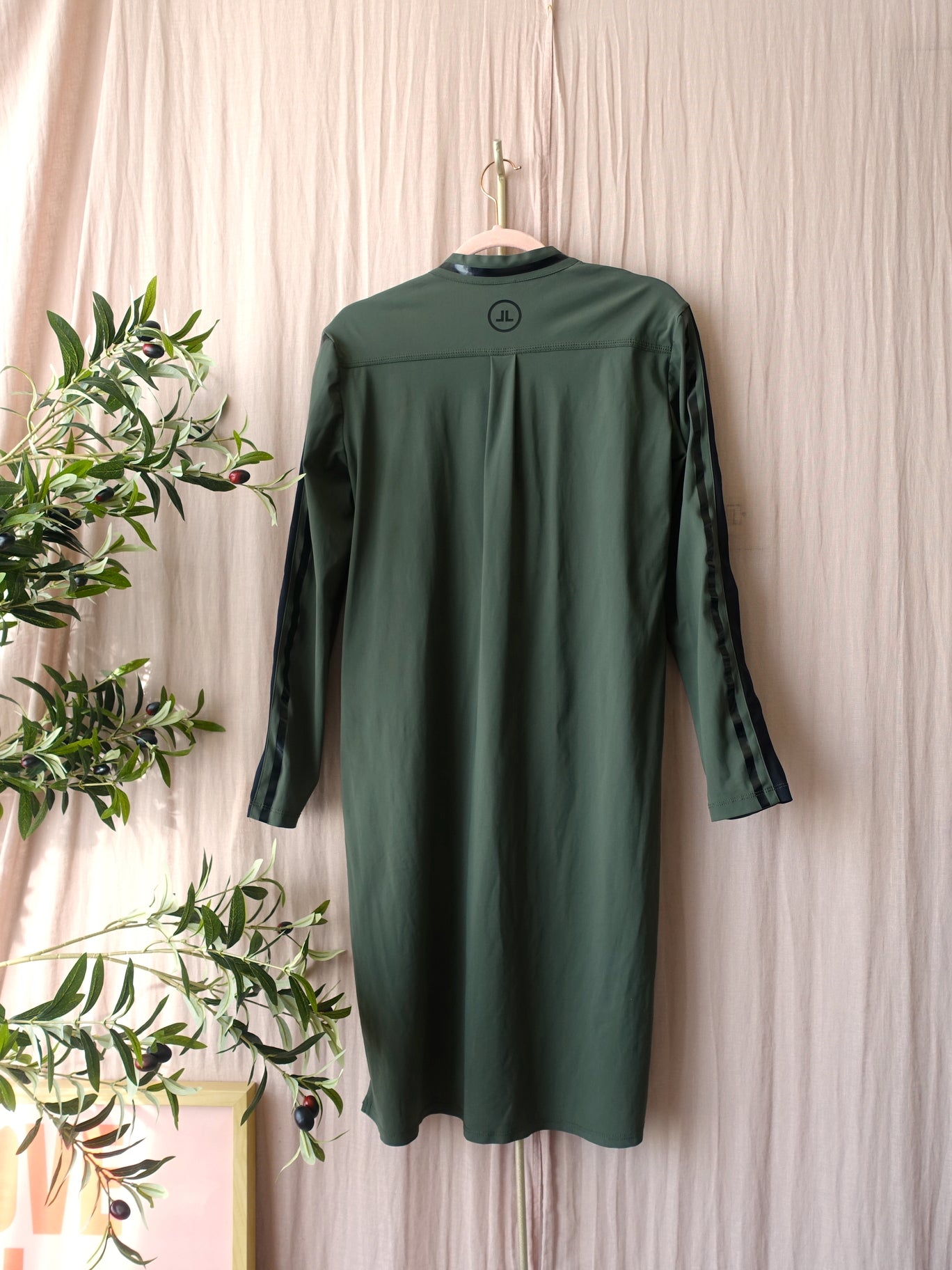 Jane Lushka is een merk met veel travelstof items waarvan je de kwaliteit kunt vergelijken met Penn & Ink en Studio Anneloes. Goede kwaliteit dus. Niet gek dat de items van Jane Lushka populair zijn bij Pindawerk. Wie wil er nou niet een stijlvolle jurk die je niet eens hoeft te strijken en super comfortabel draagt?! Deze midi jurk heeft sportieve strepen op de mouwen en de kraag, een vrouwelijke drukknoopsluiting en een goudkleurig ritsje aan de voorzijde. De jurk heeft splitjes aan de onderzijde waardoor de achterzijde wat langer is dan de voorzijde. De donkergroene kleur komt elk najaar weer terug en kun je zowel naar een feestje als casual dragen.