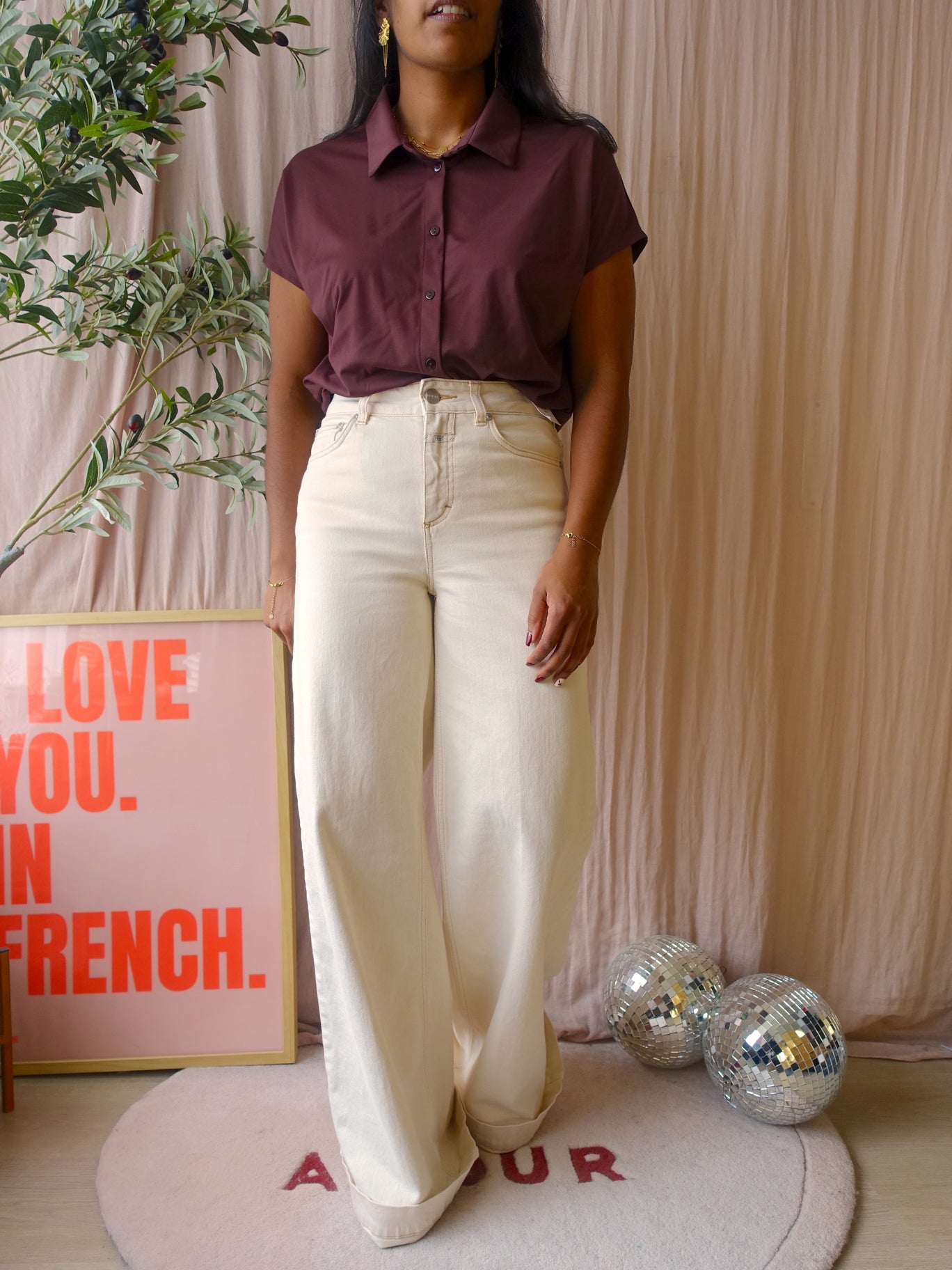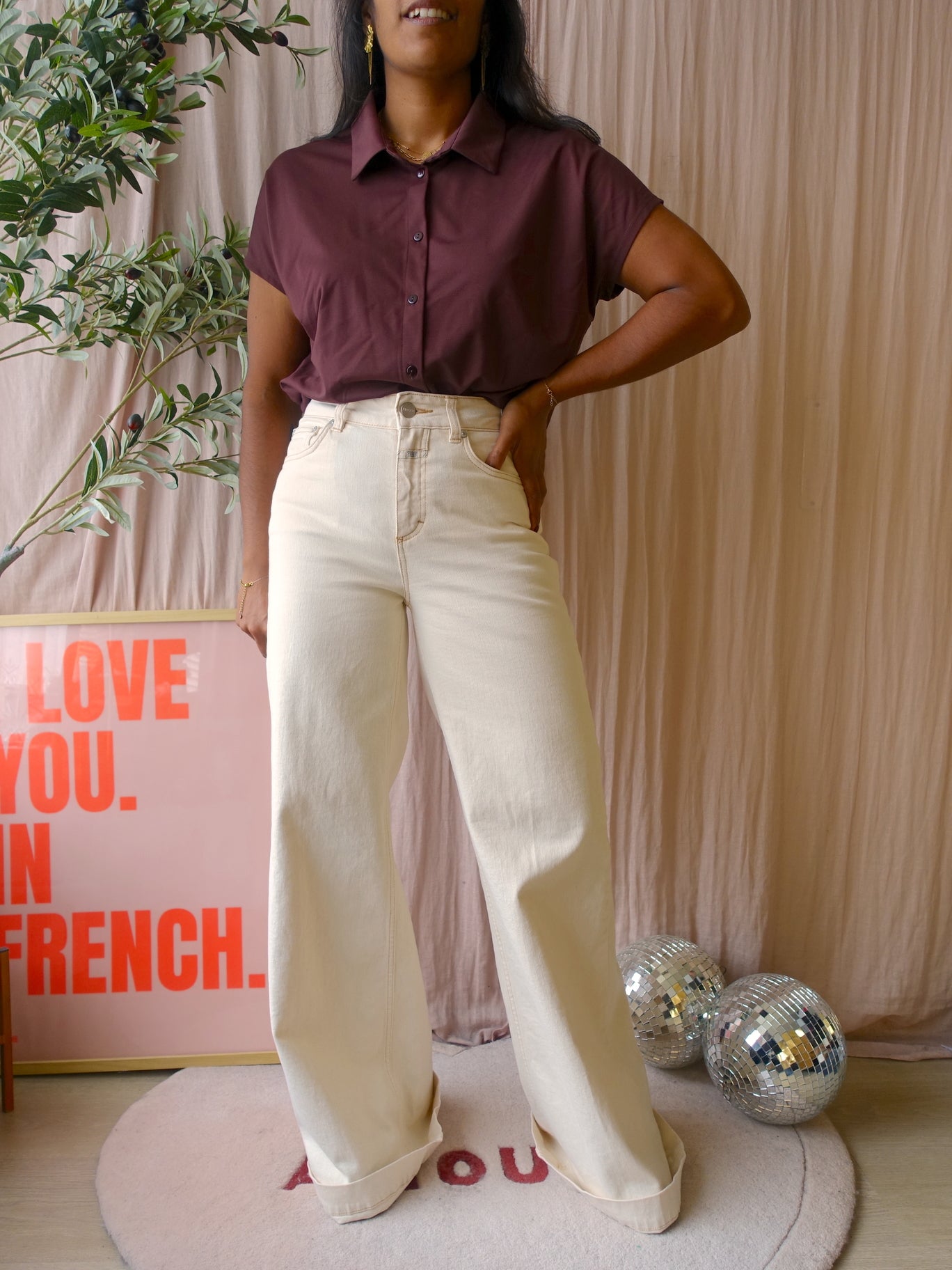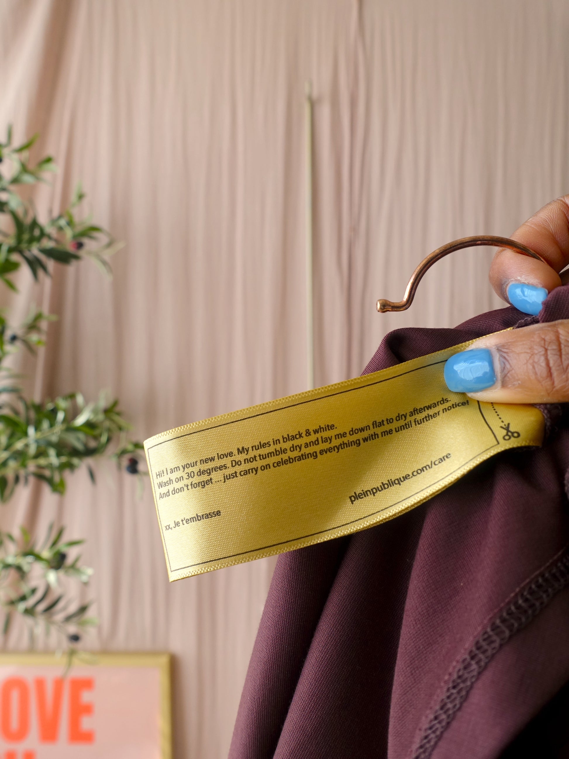 Travelstof is kreukvrij, maar als het maar lang genoeg op een propvol 'to do outfitfotografie' rek heeft gehangen temidden van 130 andere kledingstukken die op de foto moesten krijg je vanzelf een keer een kreukje hier en daar, zoals je dus ziet op de outfit foto's. Voor het opwarmen van de stomer was helaas even geen (priori) tijd omdat het donker werd, maar het resultaat van één keer met de stomer er overheen zie je gelukkig op de productfoto's, perfecto. De kwaliteit van deze Plein Publique top kun je vergelijken met die van Studio Anneloes. Sterk travelstof en een goede pasvorm. De kleur is donker bruin, prachtig! Deze is in nieuwstaat maar heeft enkel geen maatlabel meer, ik zou 'm adviseren met maat L.