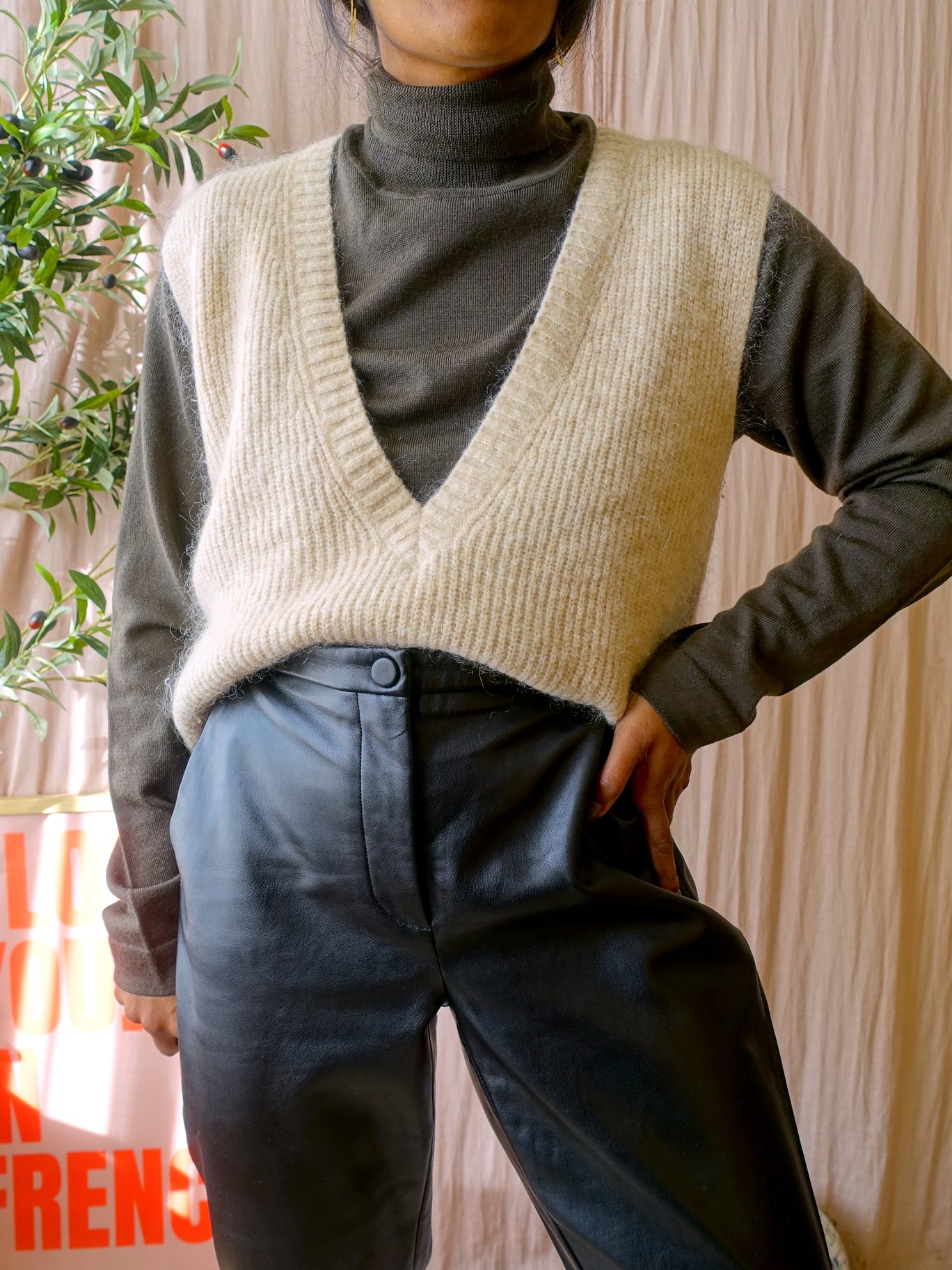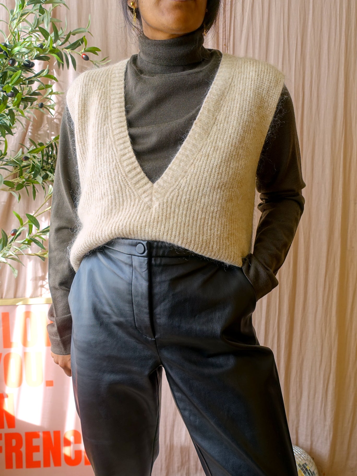 Ik von deze toffe spencer (of jawel; pullunder) van een recente collectie van JC Sophie. Deze kun je zowel over een trui als blouse dragen en komt dus het hele jaar van pas. Deze heeft een mooie diepe V-hals en een iets langere fit, heel stoer met een lange blouse er onder en een (lederen) wide leg broek. De samenstelling is een mohairmix, deze bevat ook stretch, altijd fijn! De kleur is licht warm beige.