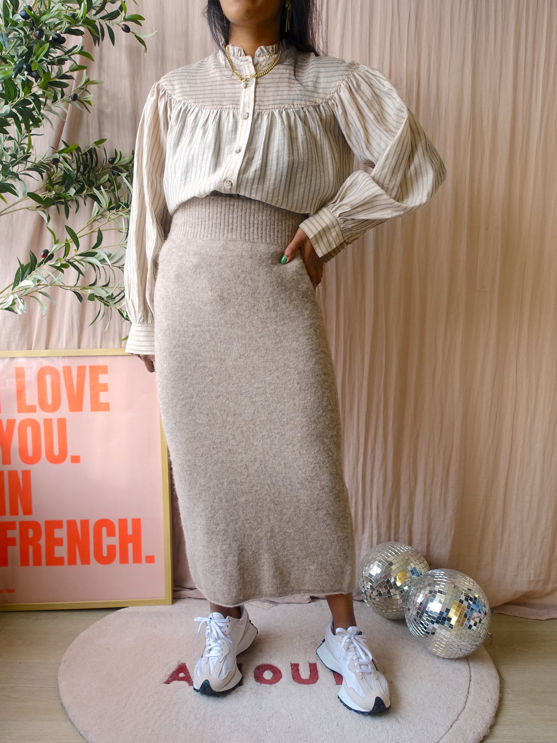 Blouses als deze blijven leuk. De Malakai blouse is luchtig en gemaakt van zacht lyocell met stretch. Deze heeft een klassieke grijze pinstripe en volumineuze mouwen. In het echt is 'ie nog mooier, beloofd. Je kunt 'm eindeloos combineren en in elk seizoen dragen en ik vond deze als nieuw, met in het carelabel zelfs nog een reseerve knoopje. Deze valt ruim, de top heeft maat S maar kun je eventueel ook dragen met maat M.