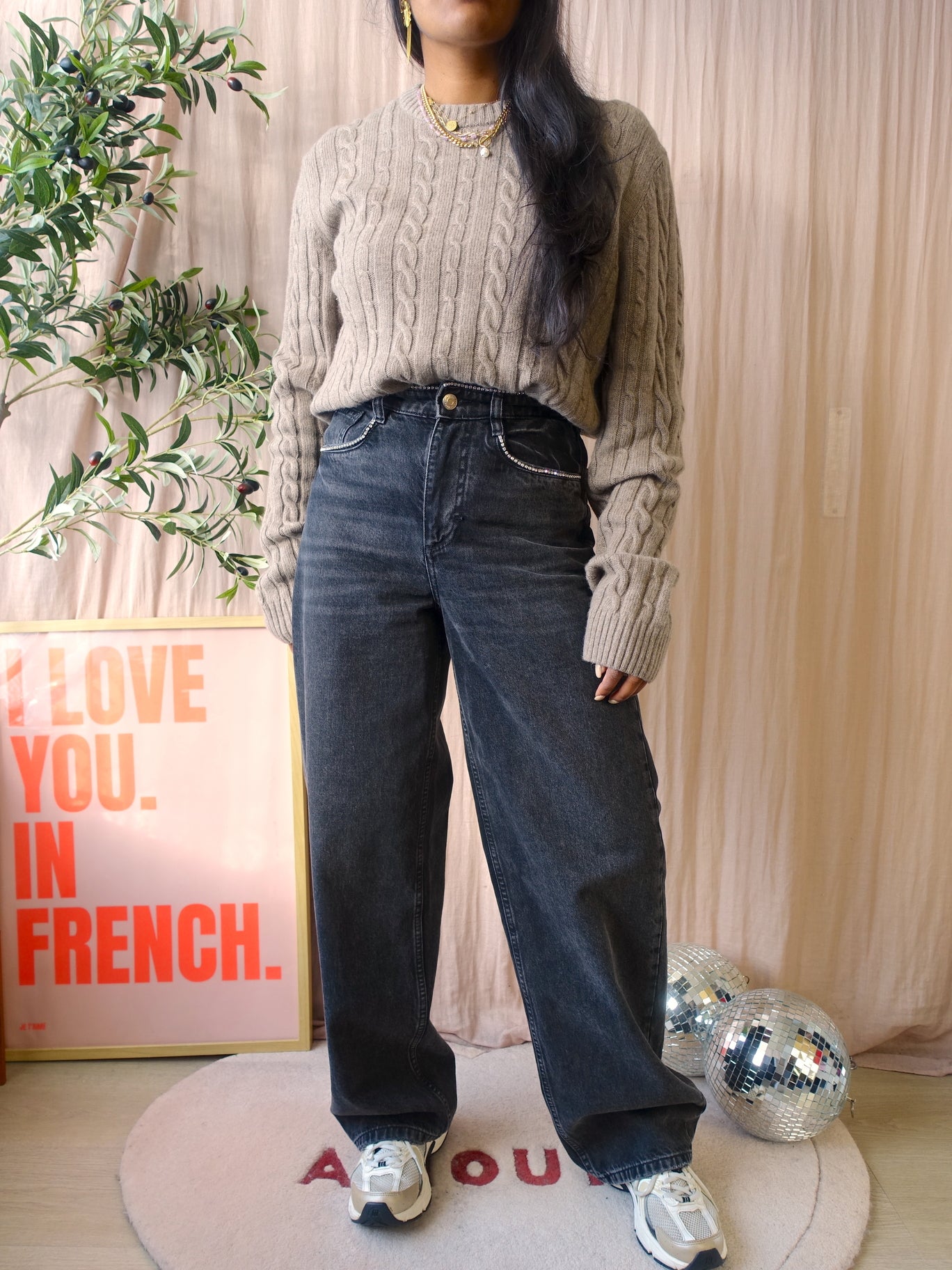 Ik had graag mijn vader in deze knit gezien, want het is officieel een mannentrui, maar dat was hem iets te 'decadent', en toen bedacht ik dat 'ie ook prima in het assortiment van Pindawerk past want zie jij dat dit een mannentrui is? Dat bedoel ik. Oké, de mouwen zijn wat lang en over het algemeen is een mannentrui ook een paar centimeter langer dan een vrouwentrui, maar mouwen kun je oprollen en je kunt deze makkelijk in je broek dragen. Stoffen als wol en kasjmier zijn bijna altijd welkom voor een tweede leven bij Pindawerk, en deze trui is super goed verzorgd en nog lekker zacht. De kleur zit tussen taupe en greige (beige/grijs) in en is erg tijdloos. De trui valt voor dames recht en voor heren slim fit.